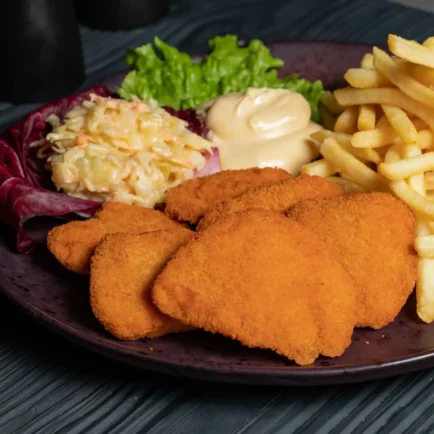 Παναρισμένες μπουκιές από στήθος κοτόπουλο, πατάτες τηγανιτές ή χωριατικες τηγανιτες πατάτες, σαλάτα coleslaw & Delly's σως.