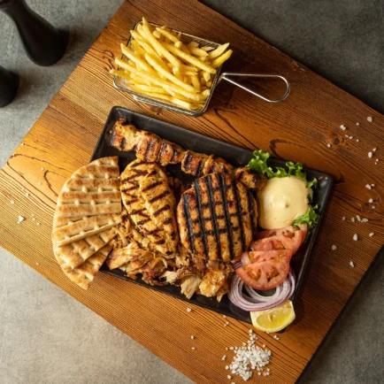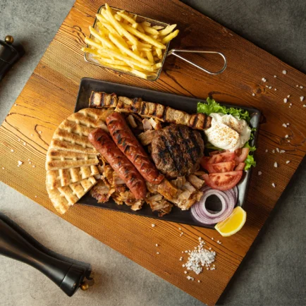 Ποικιλία κρεατικών με γύρο χοιρινό, χοιρινό σουβλάκι (1 τεμ.), χωριάτικο λουκάνικο (1 τεμ.) & μοσχαρίσιο μπιφτέκι. Σερβίρεται με πατάτες τηγανιτές, πίτα, ντομάτα, κρεμμύδι & γιαούρτι.
